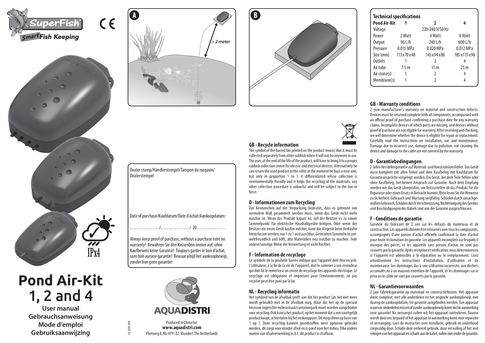Des ensembles d'aération complets pour bassins. • Ces kits sont livrés complets avec diffuseurs d'air et tuyau d'air. • Une membrane de remplacement gratuite pour une longue durée de vie. • Est idéal comme une pompe à air supplémentaire pour le filtre.